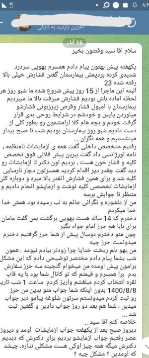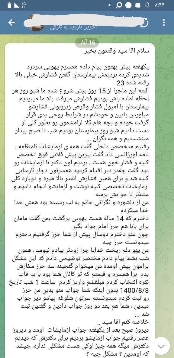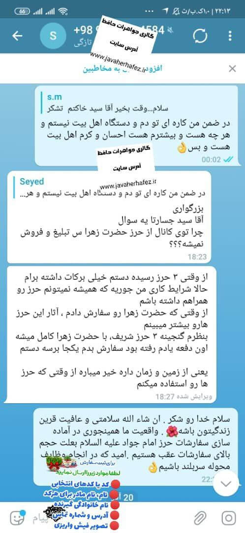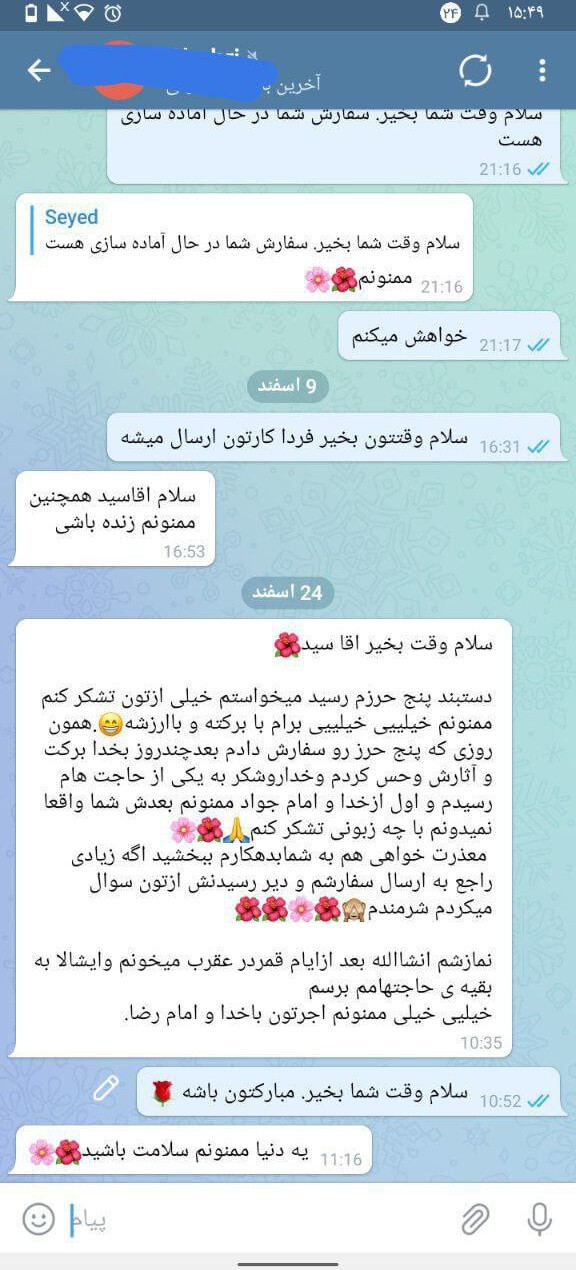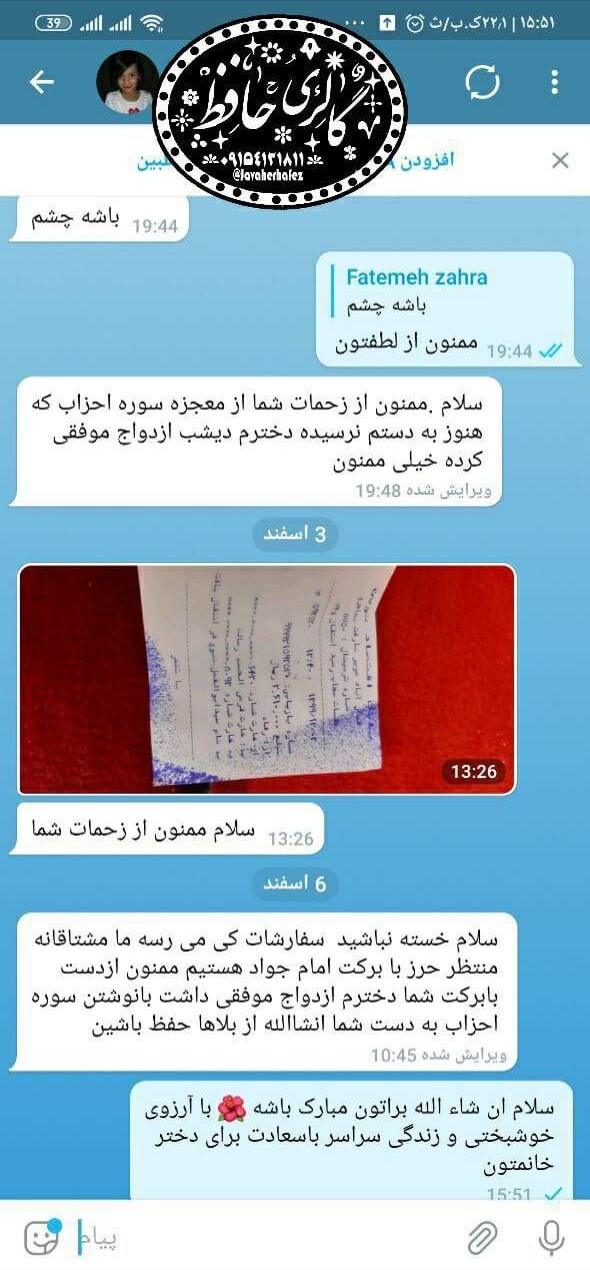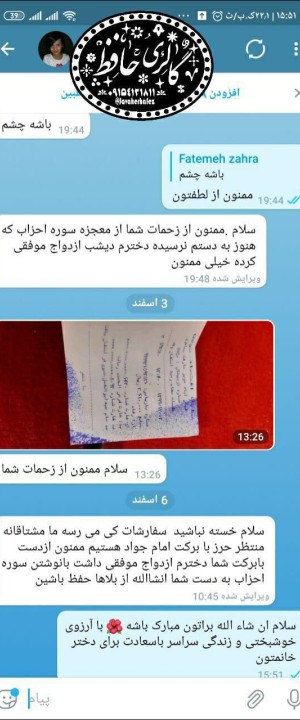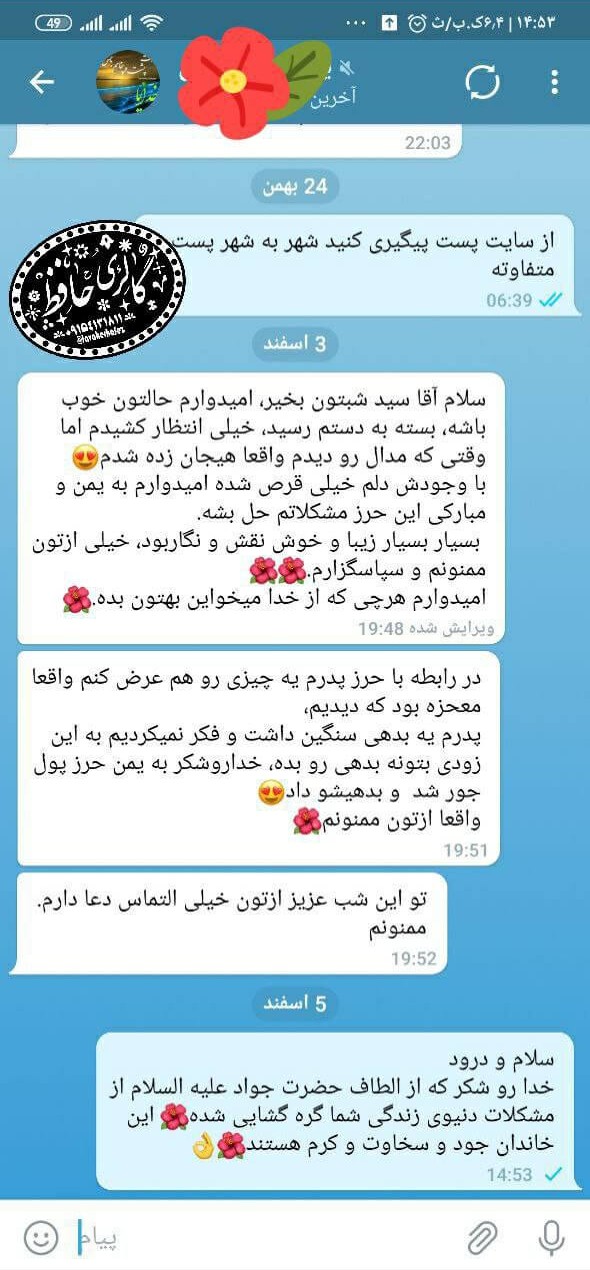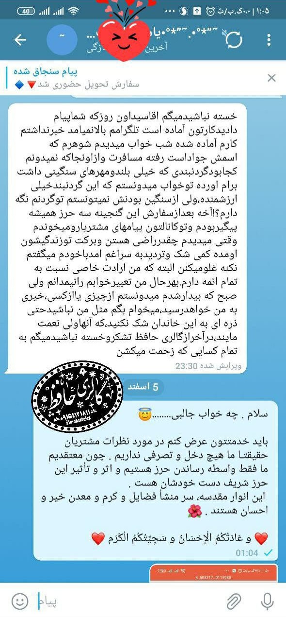 همسر یکی از کاربران دچار فشار خون بسیار بالا (۲۳) و نارسایی کلیه بود. پس از سفارش حرز (حتی پیش از دریافت فیزیکی آن)، فشار خون تنظیم شد و در آزمایشهای بعدی، پزشک سلامت کامل کلیهها را تأیید کرد و این اتفاق را «معجزه» نامید.